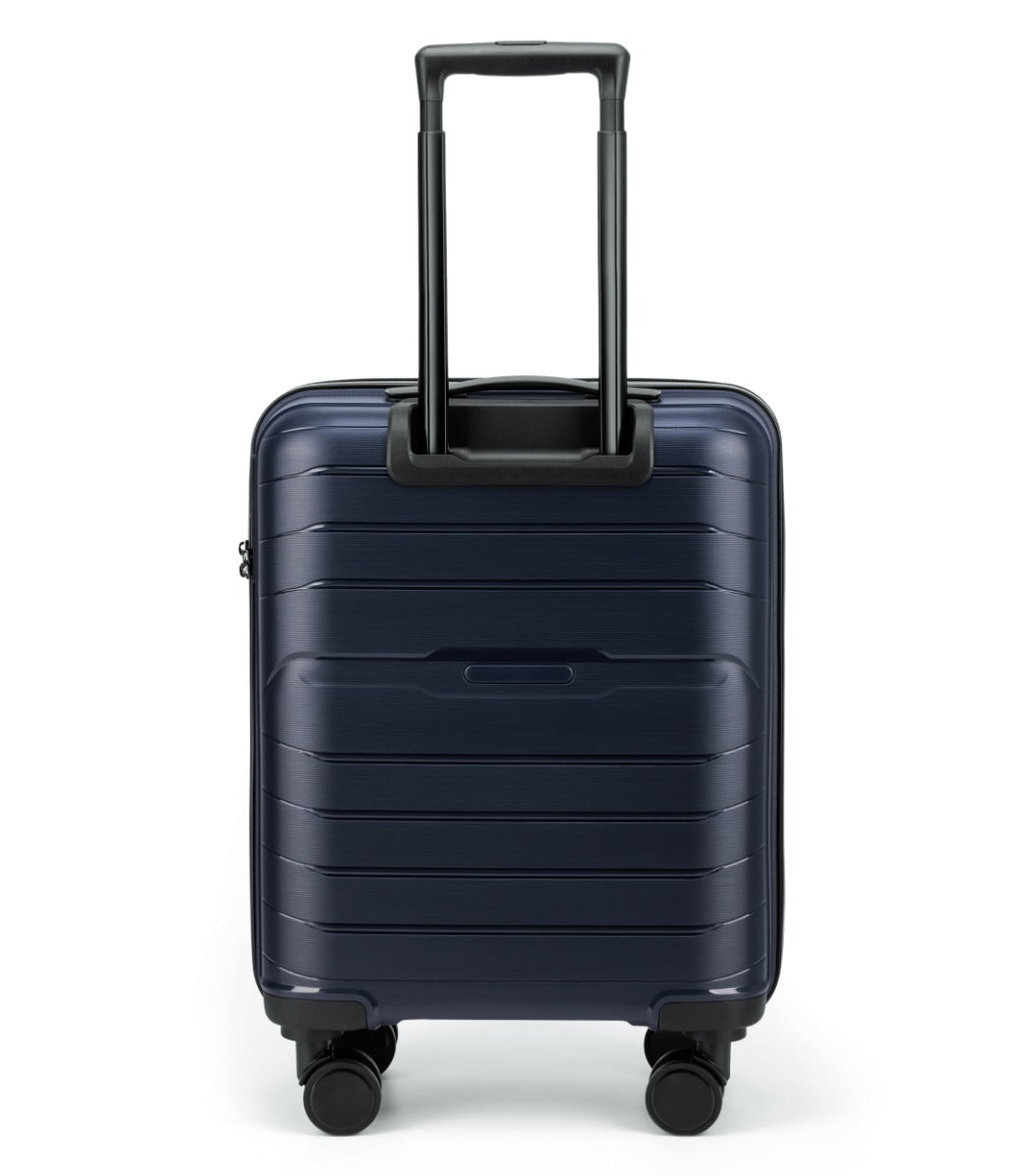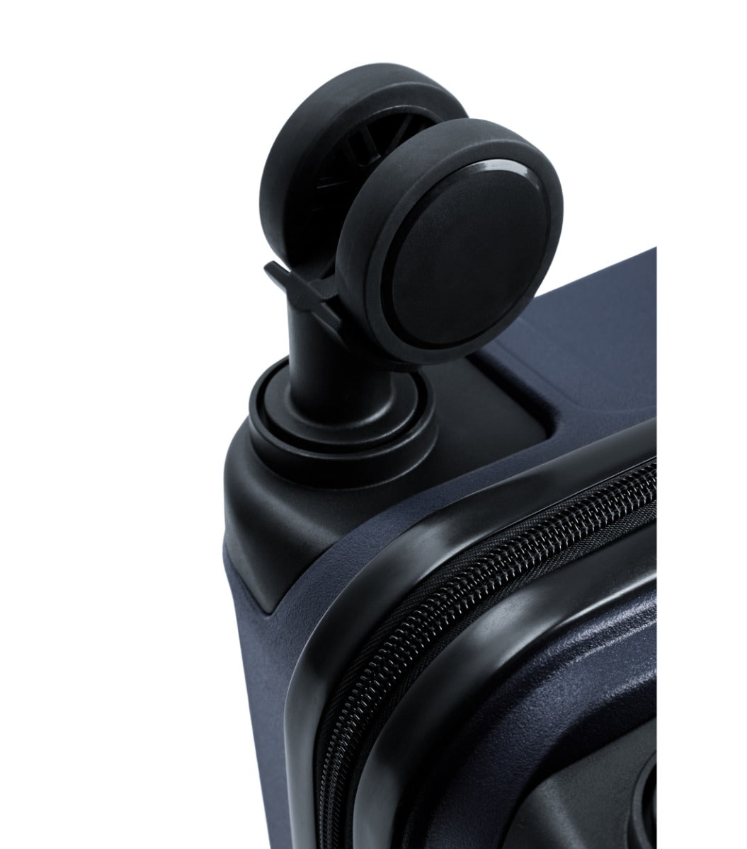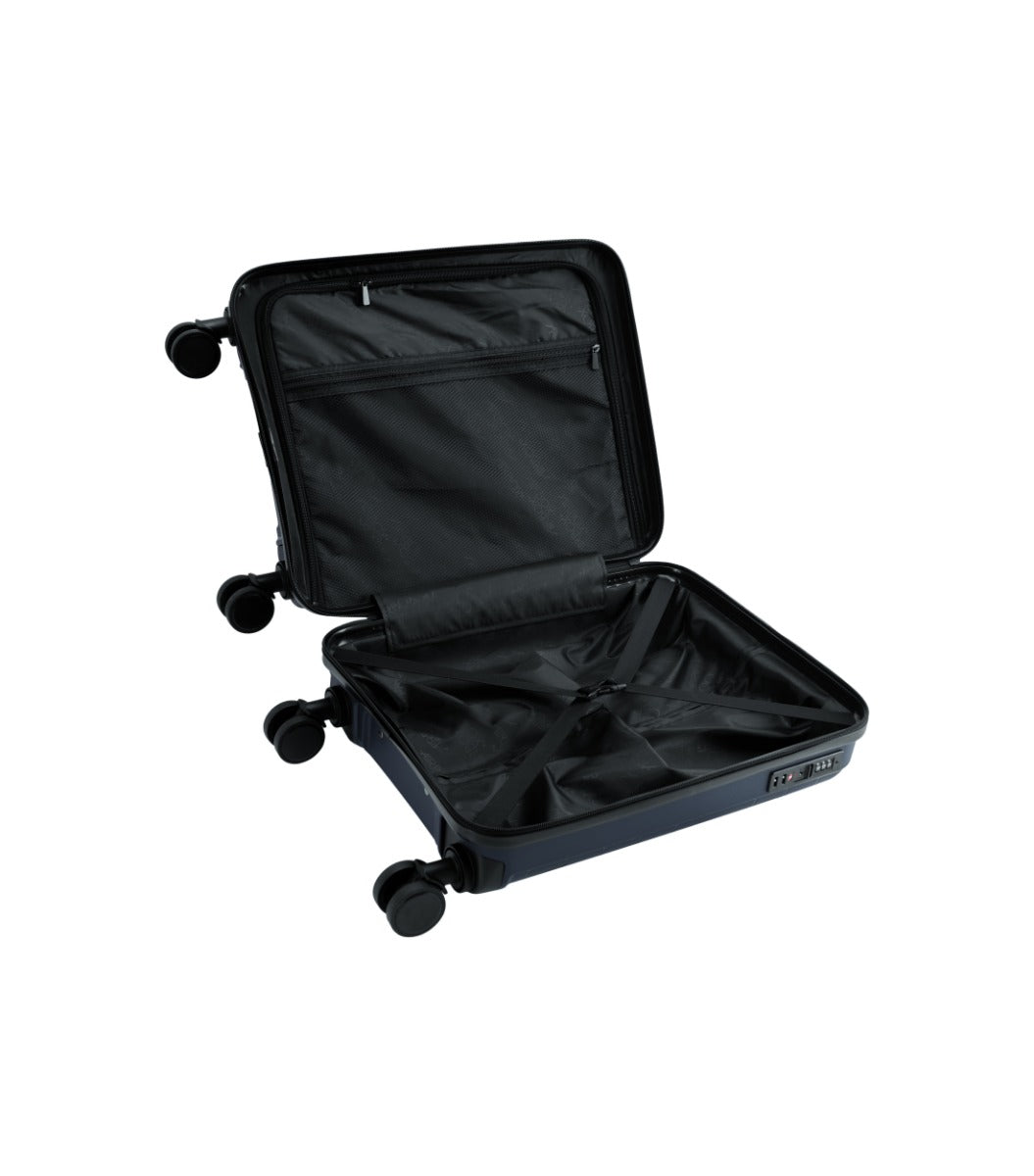 Det flade, integrerede design sikrer, at håndtagene ikke hænger fast i eksterne genstande under transport og håndtering. Kufferten er også udstyret med fire glatte og stille dobbelthjul med 360° rotation for nem manøvrering. Indvendigt har kufferten en integreret skillevæg med en lomme til organisering samt pakkestropper til at holde tøjet på plads.