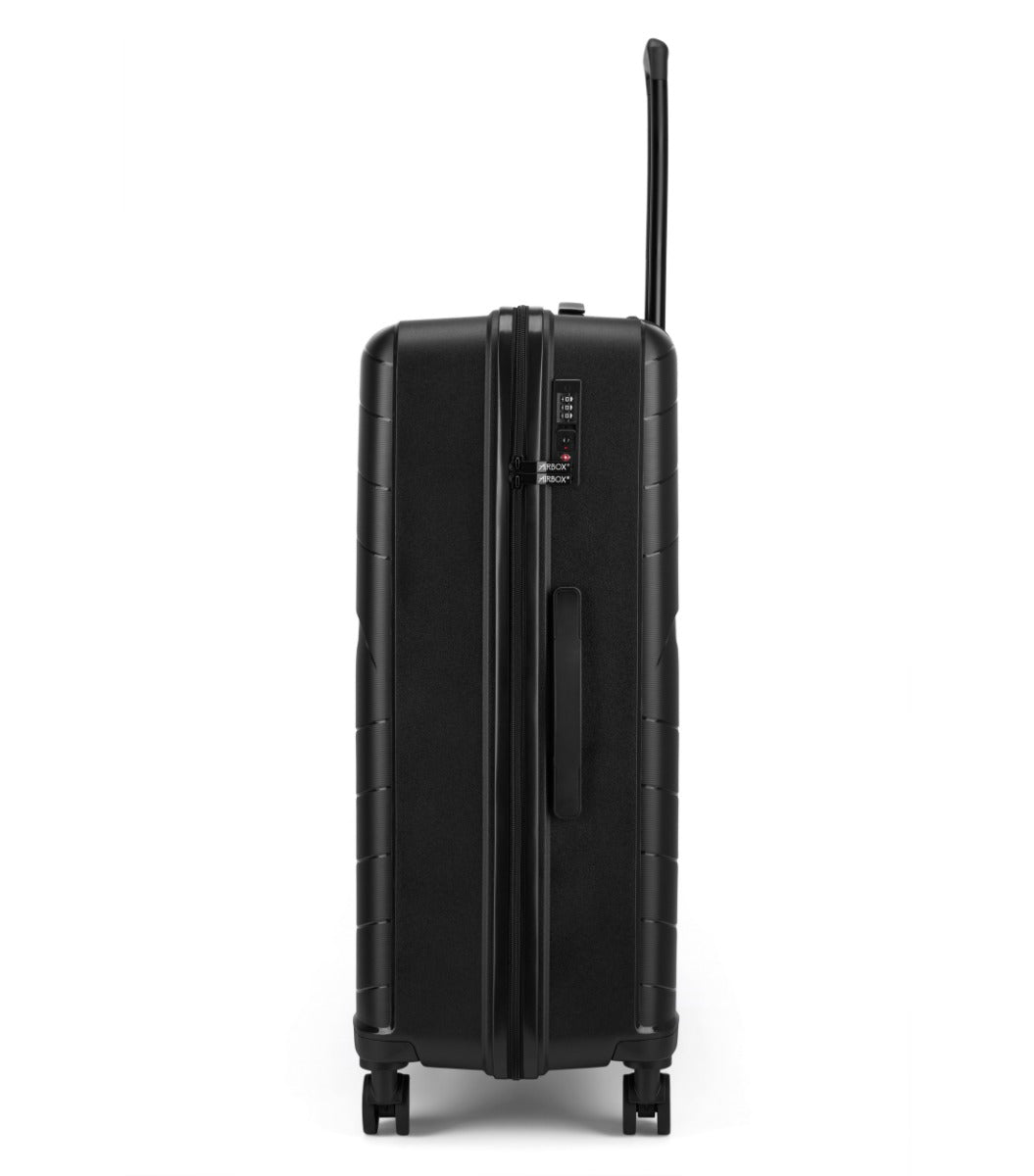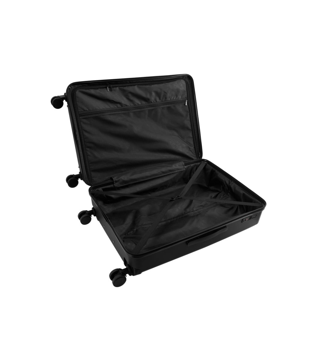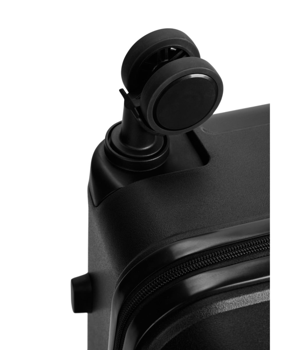 Det flade, integrerede design sikrer, at håndtagene ikke hænger fast i eksterne genstande under transport og håndtering. Kufferten er også udstyret med fire glatte og stille dobbelthjul med 360° rotation for nem manøvrering. Indvendigt har kufferten en integreret skillevæg med en lomme til organisering samt pakkestropper til at holde tøjet på plads.