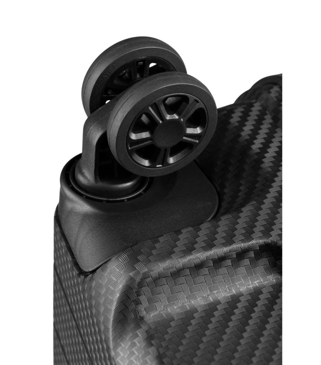 Denne kuffert er udstyret med 4 hjul. Dette giver en fordel, hvis du hovedsageligt skal transportere kufferten henover et jævnt terræn. Derudover giver det dig mulighed for at skubbe kufferten i stedet for at trække den.