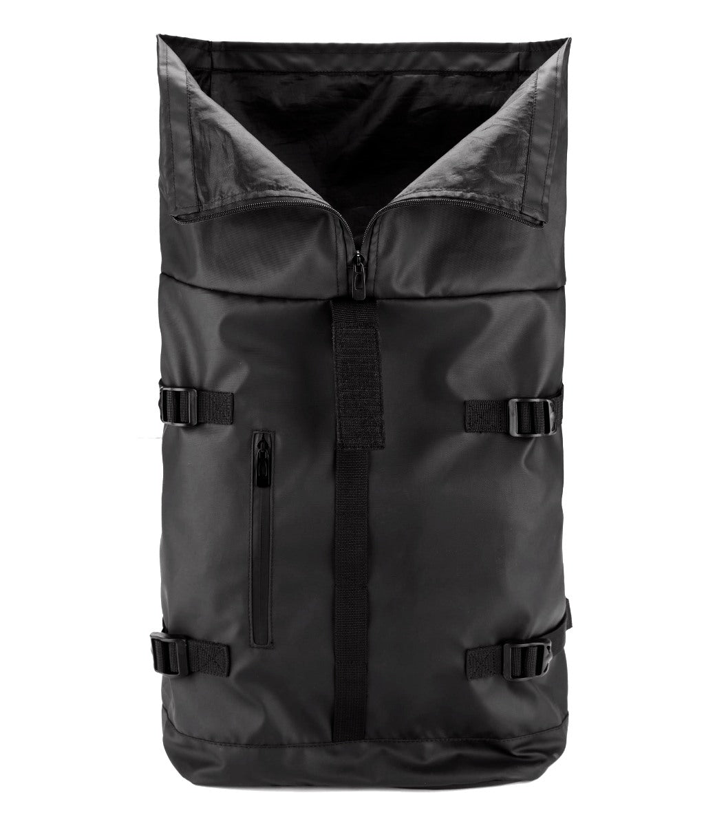 Rygsæk med roll-top i vandafvisende PU 600D polyester med svejsede lynlåse der holder indholdet tørt i vådt vejr.