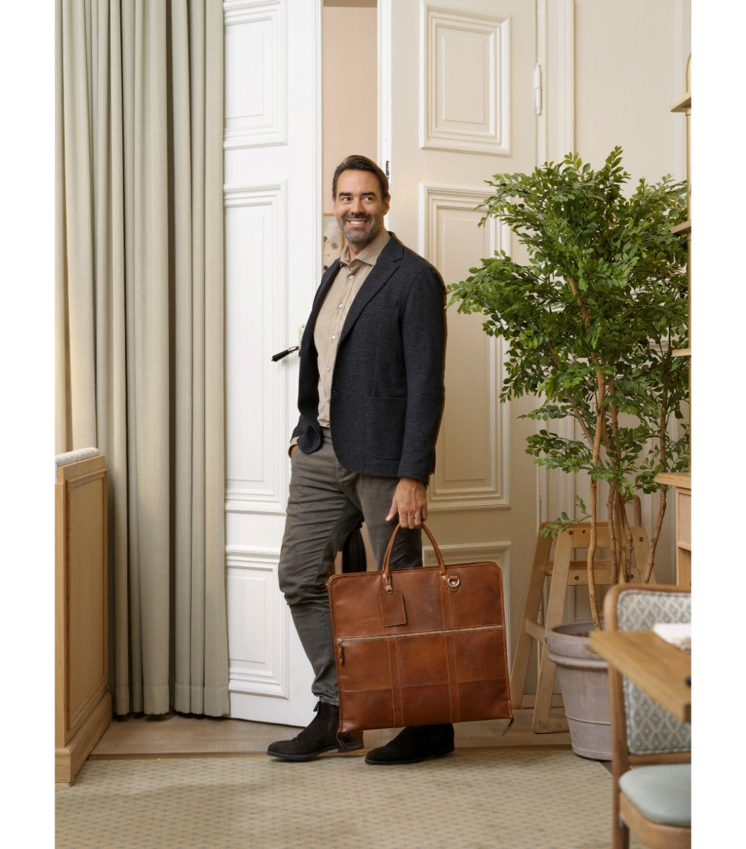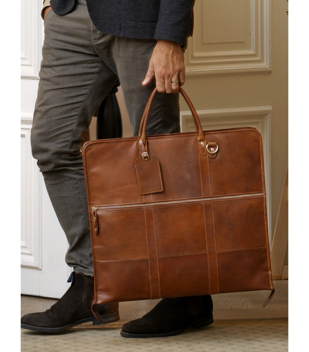 Rejsegarderobe tasken er fremstillet i flot kalveskind og er udstyret med dobbelt lynlås lukning, udvendigt rum med lynlås samt bærehåndtag. Tasken er foret med flot bomuldsfor med lynlås for beskyttelse af tøjet. Dertil ophæng til egen bøjle samt krog til ophæng op vægkrog. Perfekt til ferien eller forretningsrejsen!