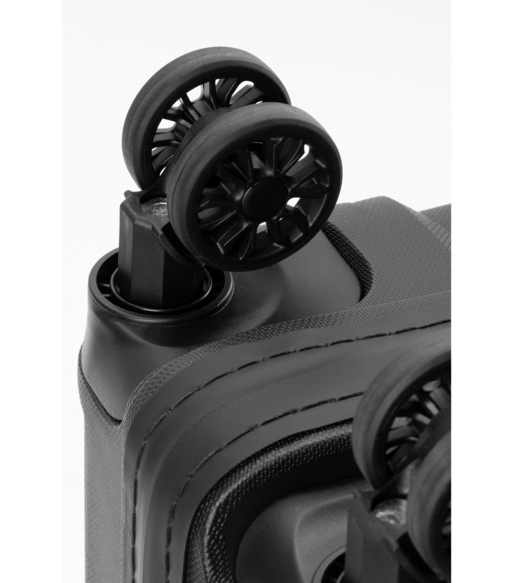 Denne kuffert har større og mere robuste "twin" DualTRAK hjul, som tilbyder en bedre manøvre på alle overflader. Dækket er lavet af et blødt, holdbart og lydløst materiale.