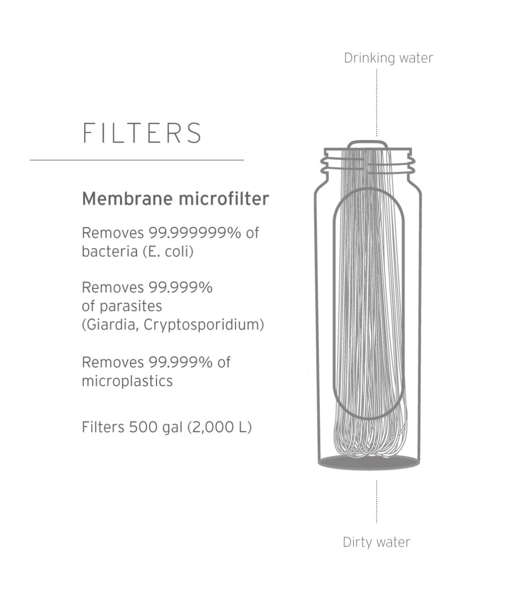LifeStraw Peak Squeeze Bottle er en alsidig og kompakt vandfiltreringsflaske, der er ideel til vandreture, trail-løb og eventyr, hvor pladsen er begrænset. Den beskytter mod bakterier, parasitter, mikroplastik, silt, sand og uklarhed i vandet. Flasken er fremstillet af førsteklasses materialer, hvilket gør den yderst slidstærk og modstandsdygtig over for lækager. Med en vægt på under 4 ounces er den ultralet og sammenklappelig, hvilket gør den nem at tage med på farten. Du kan bruge den som et sugerørfilter, opbevaringsløsning, eller forbinde den med andre Peak Series-systemer for at passe bedst til dit eventyr. Membranmikrofilteret har en levetid på op til 2.000 L (500 gallons).
