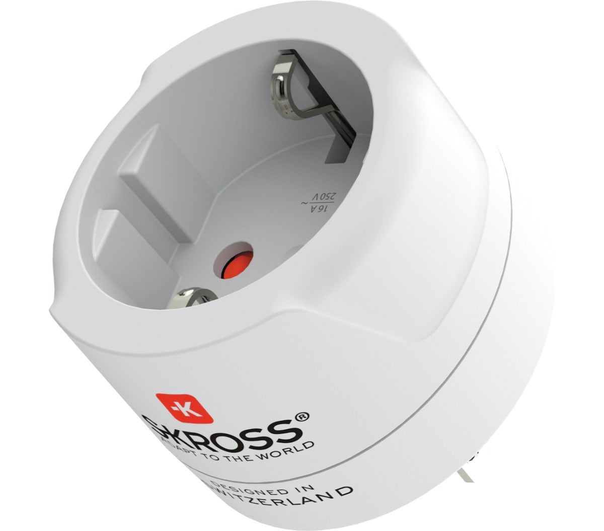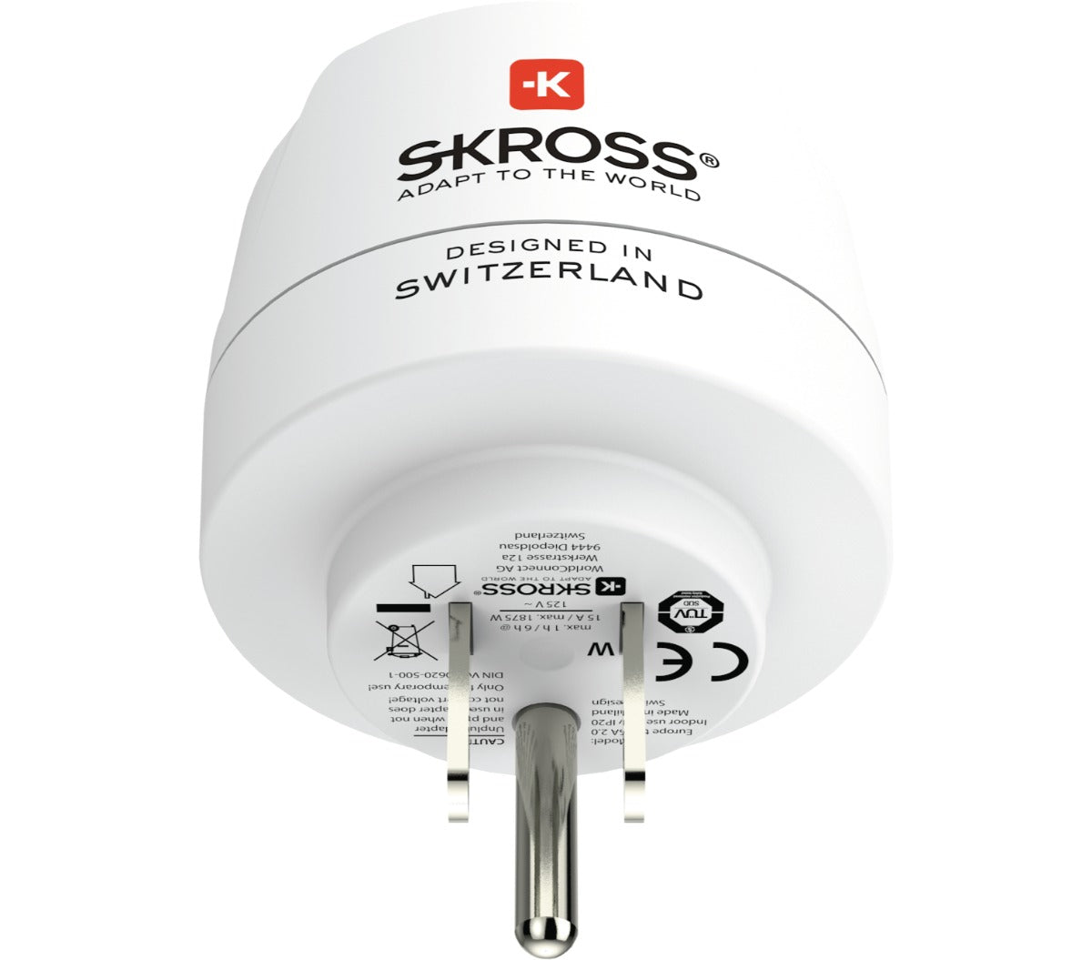 Her får du en rejseadapter, som passer til USA. Adapteren er fra mærket Skross, som er kendt for at lave kvalitets elektronik.