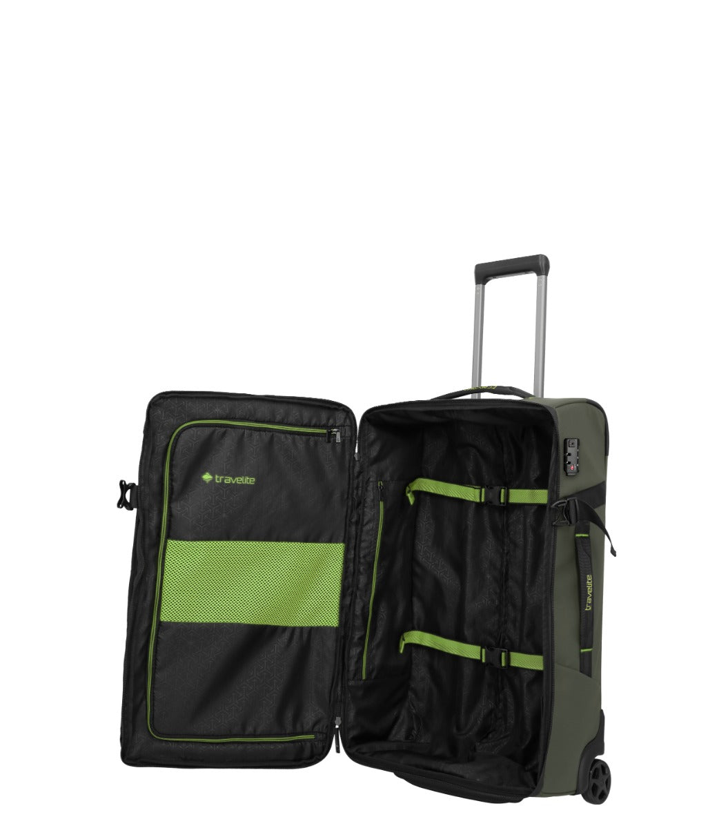 Kufferten er fremstillet af et slidstærkt og vandafvisende materiale, der beskytter dine ejendele mod fugt og lettere regn. Den rummelige kapacitet giver plads til alt det nødvendige, mens praktiske lynlåslommer gør det nemt at organisere dine ting.