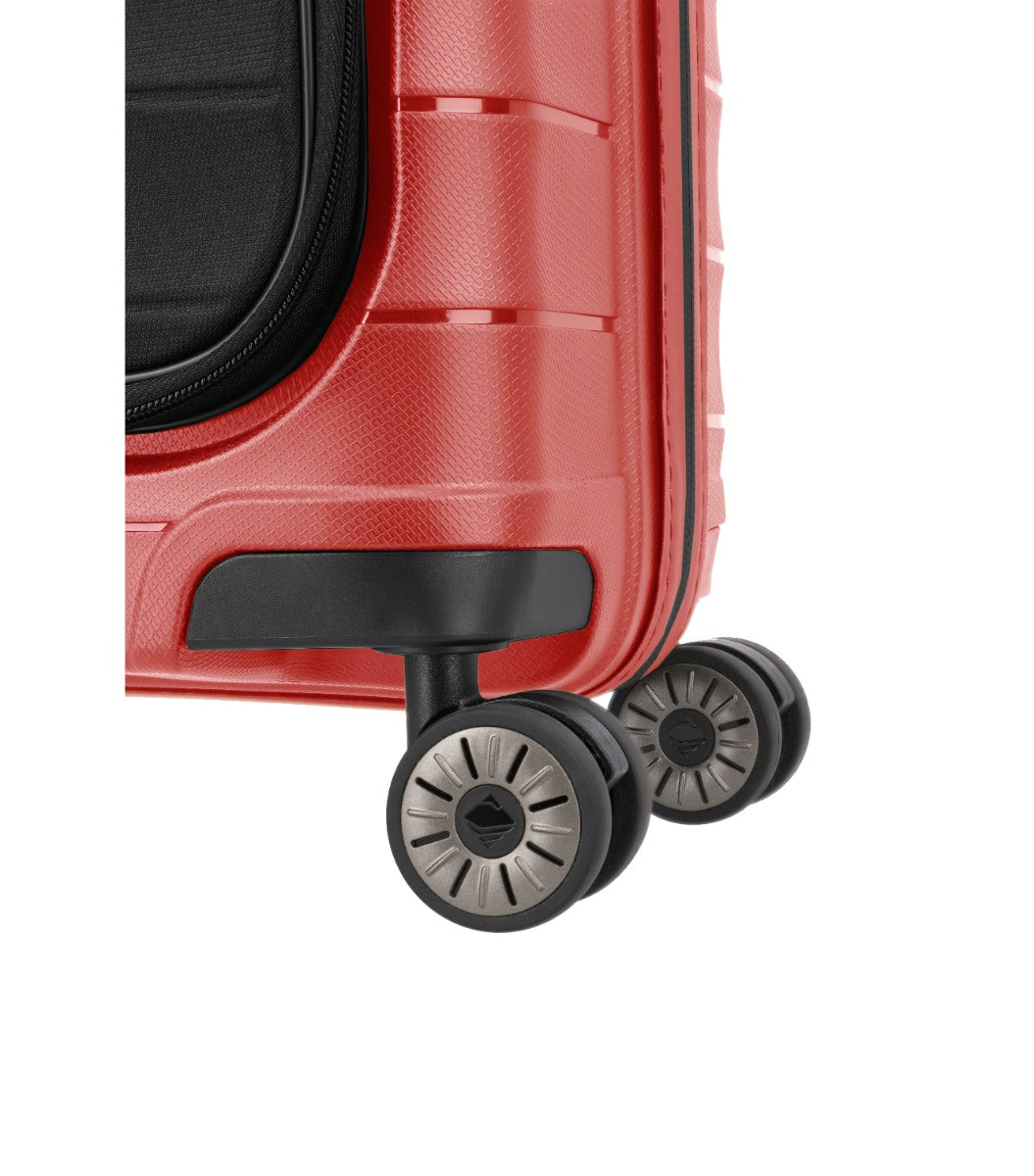 Denne kuffert er udstyret med 4 hjul. Dette giver en fordel, hvis du hovedsageligt skal transportere kufferten henover et jævnt terræn. Derudover giver det dig mulighed for at skubbe kufferten i stedet for at trække den.
