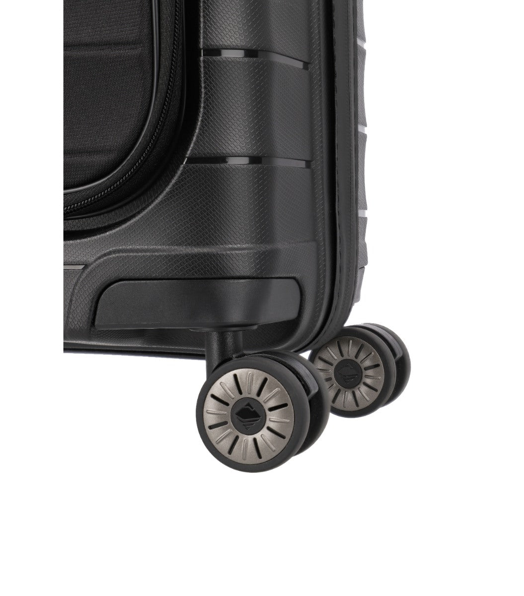 Denne kuffert er udstyret med 4 hjul. Dette giver en fordel, hvis du hovedsageligt skal transportere kufferten henover et jævnt terræn. Derudover giver det dig mulighed for at skubbe kufferten i stedet for at trække den.