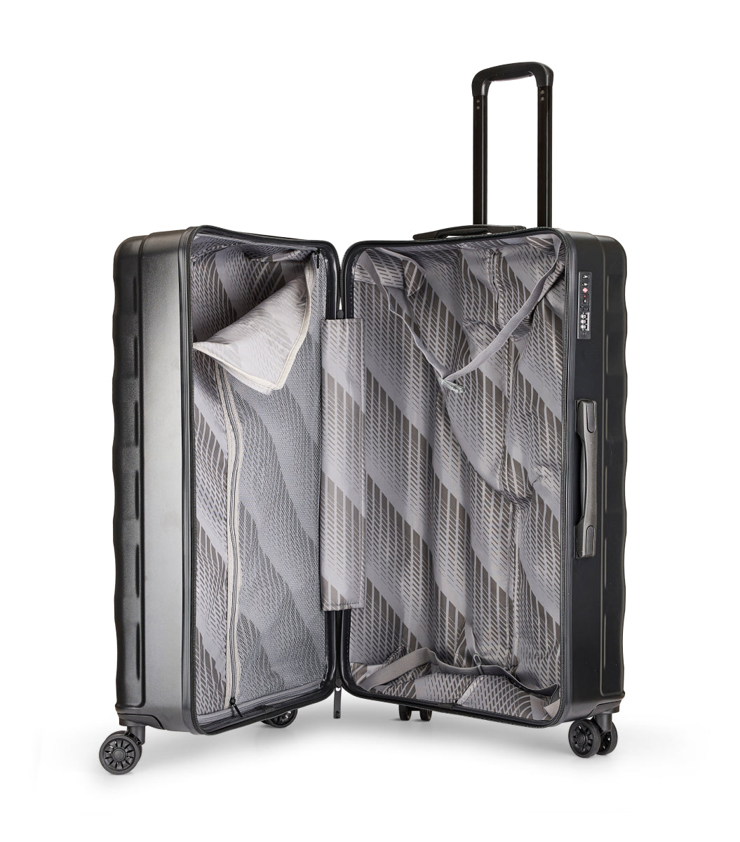 Alle størrelser er udstyret med en fast og stærk hardcase-overflade, der kan tåle hårdhændet behandling på bagagebåndet. Det indvendige pakkesystem gør det nemt at organisere tøjet, så du hurtigt finder det, du skal bruge. Og med TSA-lås er du sikret, hvis turen går over Atlanten.
