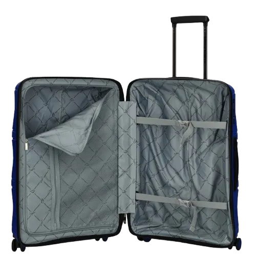 Indvendigt har kufferten et rummeligt hovedrum med en lynlås, der holder dine ejendele sikkert på plads under transport, intern lynlåslomme og en rem, der holder dine ejendele fast og organiseret.