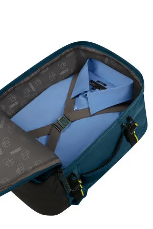 Bagpå er der en smart sleeve-strop, så tasken nemt kan fastgøres til en kuffert, de ergonomiske rygsækremme sørger for, at tasken er behagelig at bære over længere perioder, der er også en flaskeholder på siden, hvilket gør det praktisk at have drikkevarer med på farten, det klassiske American Tourister-logo er fremhævet på forsiden af tasken.