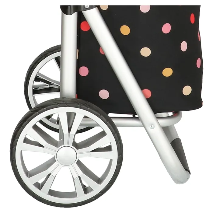 De store hjul sikrer stabil kørsel på både fortove og mere ujævnt terræn. Samtidig er de skånsomme mod gulve og kan nemt afmonteres ved behov. Det ergonomiske håndtag giver et behageligt greb, og støttefoden sørger for, at vognen står stabilt, når du parkerer den.